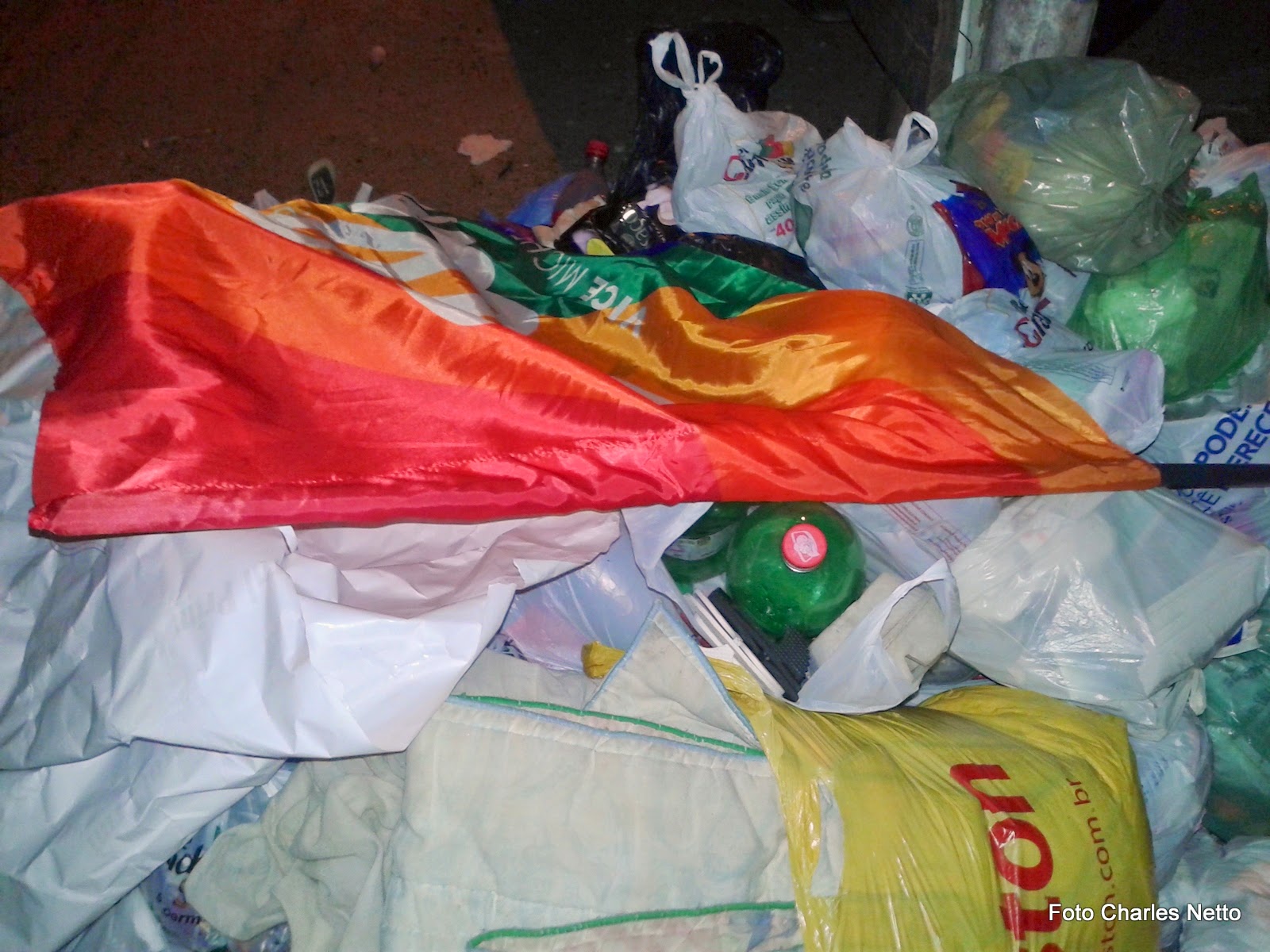 VEJAM DE QUAL PARTIDO FOI QUE ENCONTREI ESSA "BANDEIRA ATIRADA NO LIXO" LOGO DEPOIS DO DEPBATE POLÍTICO DESSE DIA 24 DE OUTUBRO DE 2014... 'AGORA A POUCO DE NOITE" QUEM JOGOU FORA SIMPLESMENTE ASSIM TAMBÉM PODEIRA TER QUEIMADO OU RASGADO, MAS APENAS JOGOU FORA NO LIXÃO, NÉ????????????